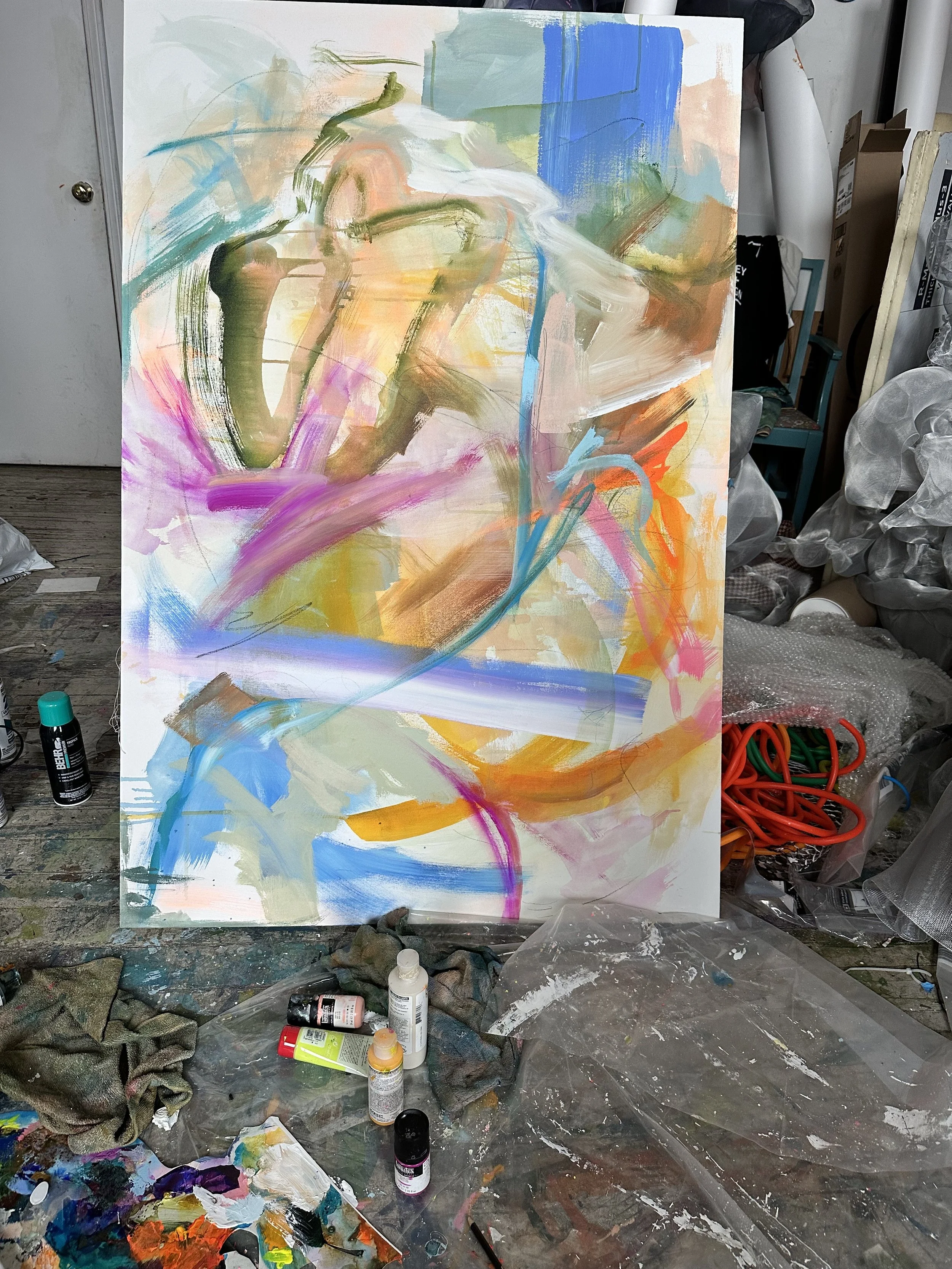 Lundsager starts with an idea—the yellow line going through all four paintings for example—but then allows the work to take over. “It’s like you’re walking toward something, but you don’t want to just look at what you're walking towards, you want to be aware of what’s happening around you now, and be able to pay attention to the moment, to be in the moment, and not just work towards a goal because if you’re just doing that, you’ll miss new insights that pop up. You have to be able to see things when they happen and not just look at your goal because you will miss the unexpected.”