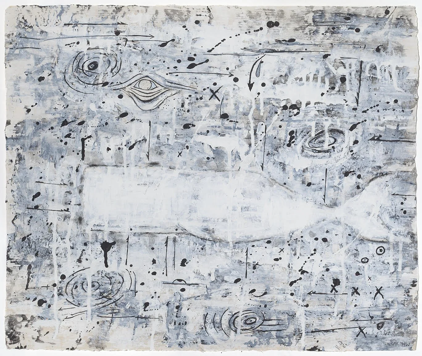 Directly on the walls of the gallery, Whitman drew silvery geometric maps, a mix of fictional and literal nautical charts which signal her intention for the show. Also included are a series of 17” x 20” paintings which draw attention to her unique vernacular. Whale tales, wrinkled eyes, strata, drips, arrows, harpoons, guns, nooses and the color white appear again and again throughout the show. These paintings and a few small collages flow from the main gallery into an adjoining hall. Don’t forget to look up above the main gallery entrance to see a collection of historic harpoons the artist selected from the museum’s archive.