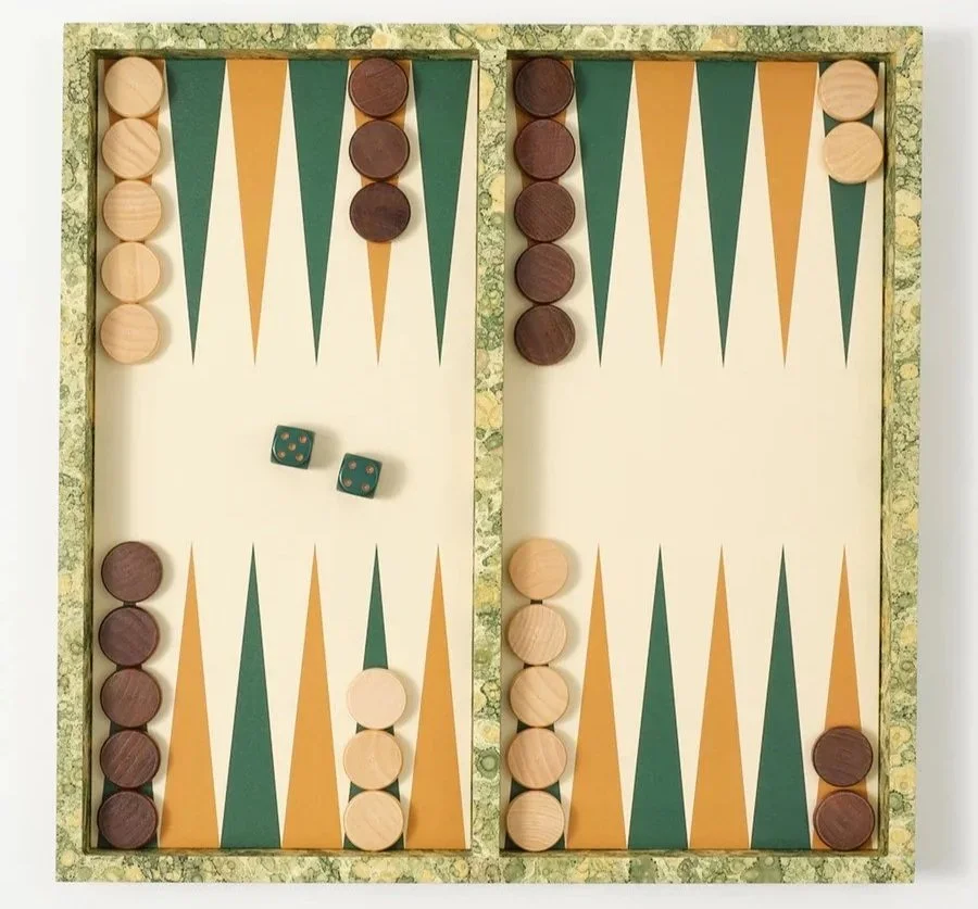 This gorgeous game board, handmade in Florence, wrapped in premium Italian paper, combines two unique designs: a classic geometric floral pattern in deep green and ochre, and a complementary marbleized finish that evokes the rich texture of antique stone. Game on!