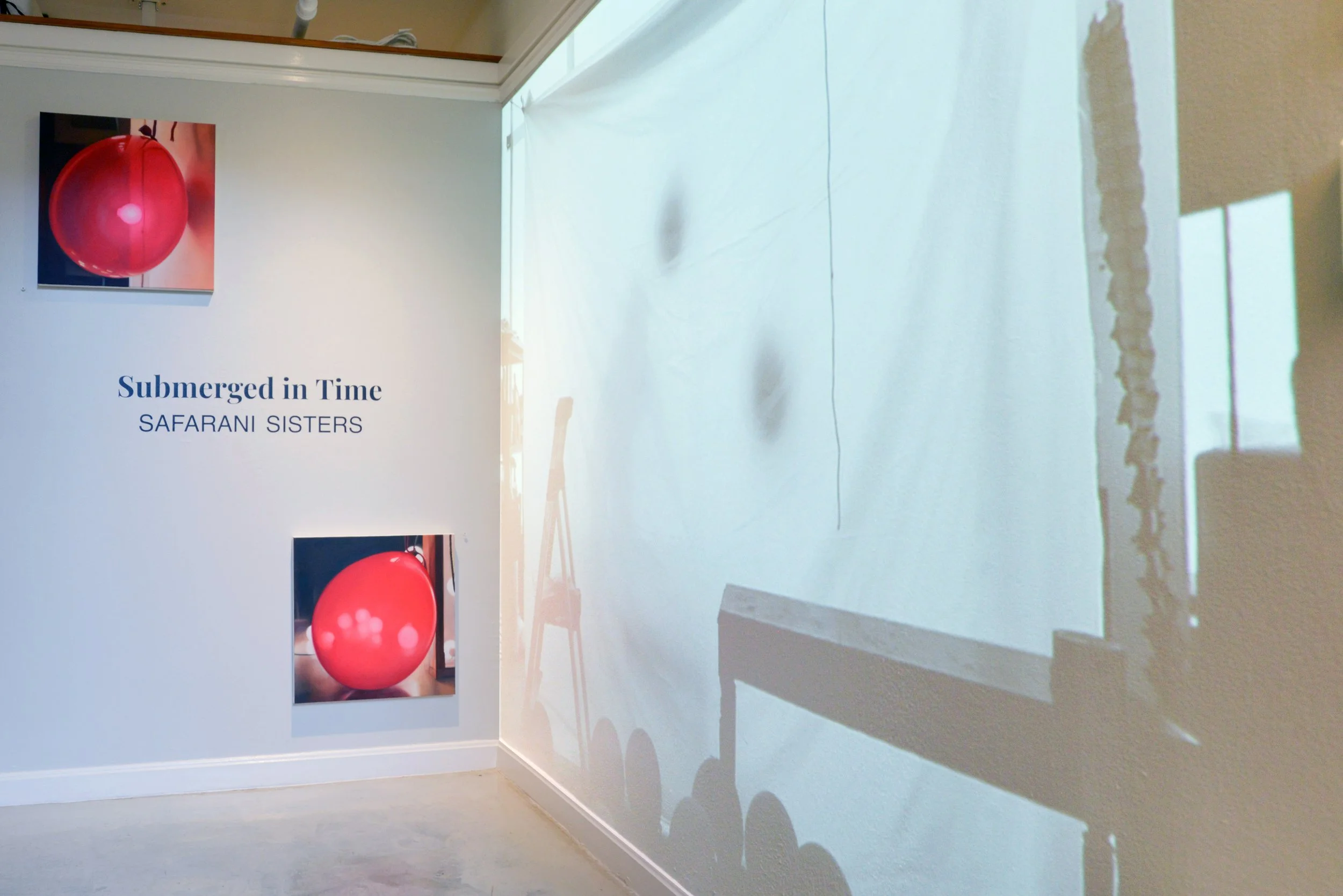 Red balloons become potent symbols of promise, celebration, memory and remorse in a solo show of new work by Bahareh and Farzaneh Safarani at ShowUp on Harrison Avenue in Bostonβs South End. Step down into the lower-level, (mercifully cool) gallery and find yourself immersed in the Safarani Sisters' mysterious, ethereal world. The title of the showβSubmerged in Timeβis an invitation. The Safarani's work is so intimate, and the curation is so intentionally spare and uncrowded, that time feels slowed-down. Itβs cathartic to be submerged in the artistsβ meditative interiority.
