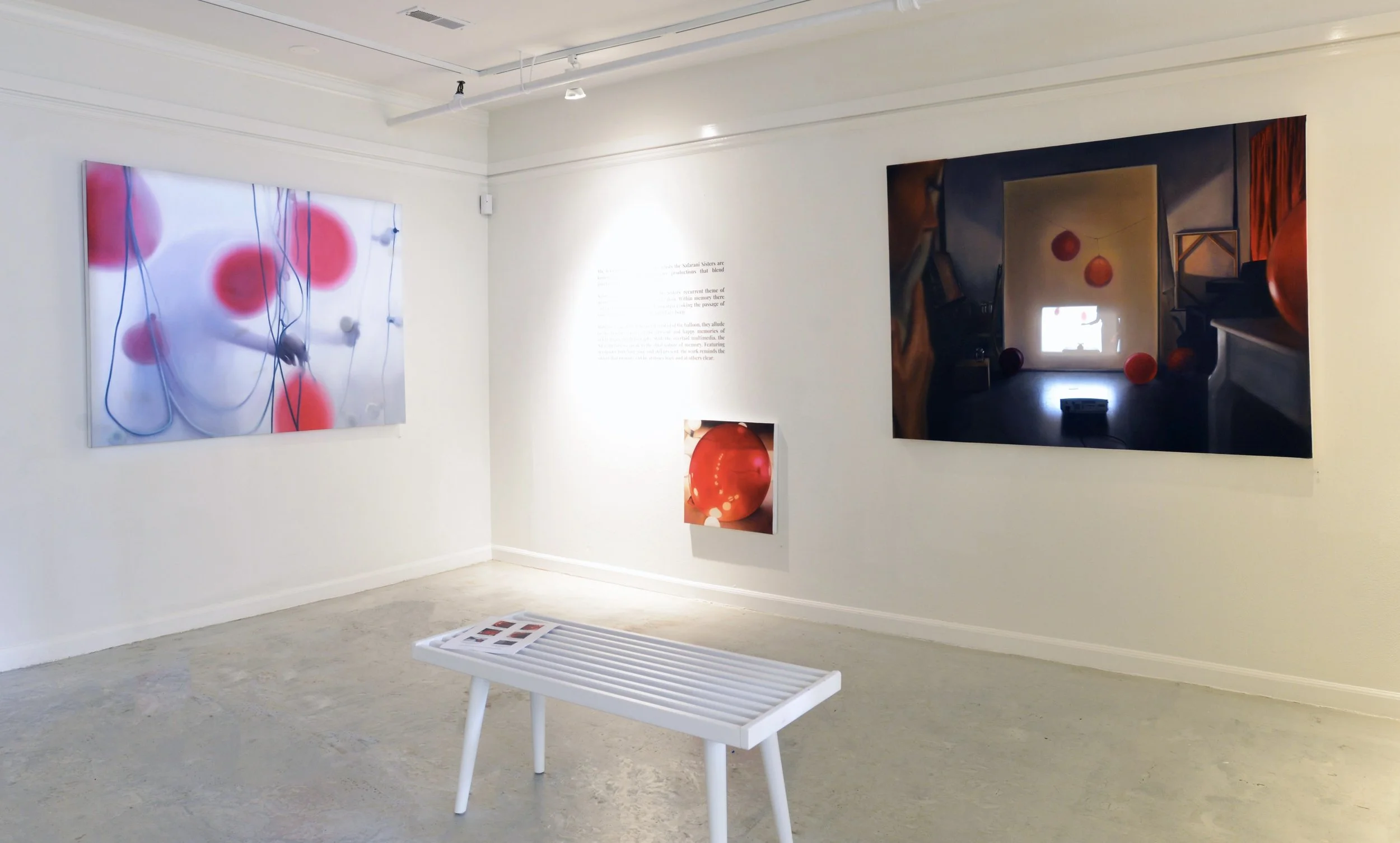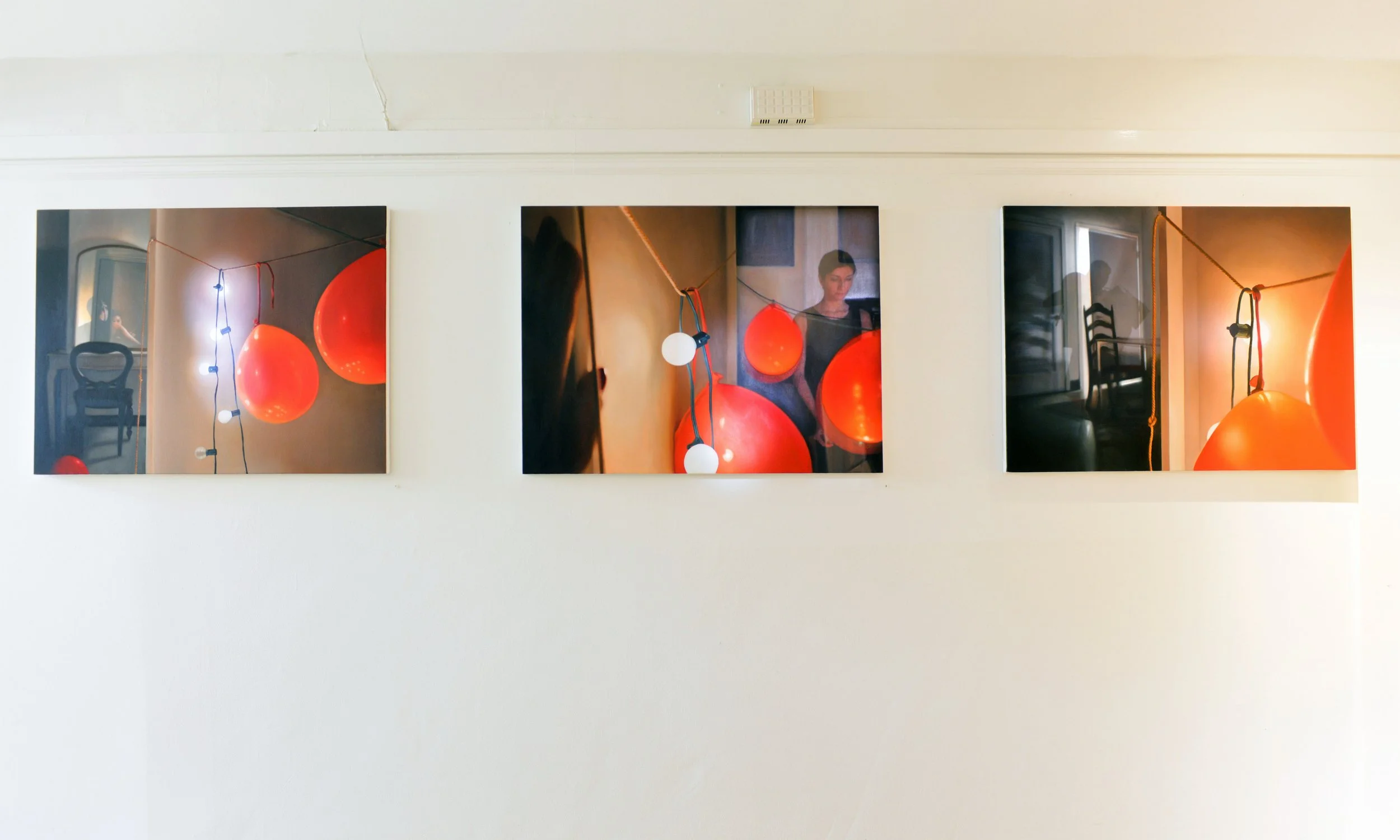 The show also includes three 30 x 40 inch piecesβEn-lightened, Leave the Moment Hanging, and Isolated Contentmentβwhich have been hung together almost in the manner of a triptych, and five tightly-cropped paintings of single red balloons, alternatively or simultaneously reflective and transparent. Two non-video works capture the source of remorse: Shadow of a Memory #1 and #2 are black and white photographs on which the artists affixed the spent red latex of popped balloons, the shriveled aftermath of celebration.
