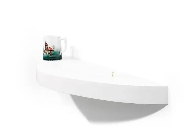 Liliana Porter, To Go Back, Woman in White, 2019. Figurine with ceramic mug on shelf. Image courtesy Krakow Witkin Gallery.